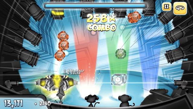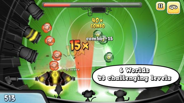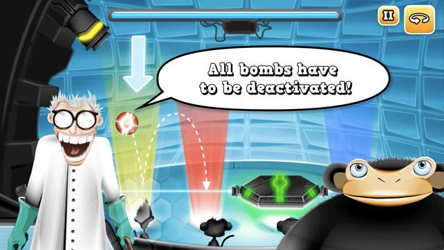 实验室中有红黄蓝绿四种颜色的洞洞,在关卡开始之后,小球会从左边弹出,至于是什么颜色会在弹射口处有一个光环提示。对号入座的玩法说起来简单,实际上这款考验玩家反应能力的游戏并不会让玩家“好过”,由于不同颜色的小球有出场顺序的差别,因此我们需要利用一个挡板来将它们挡住并逐个弹向正确孔位。每一个关卡的最高评价是五颗星,要达到这样的评价必须一个不落地将小球对号入座。