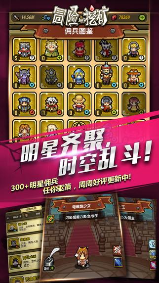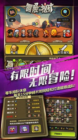 《冒险与挖矿》将像素与情怀、策略与休闲、动漫与现实完美融合。游戏中包含英雄乱战、冒险闯关、地心挖矿等各色玩法,结合休闲挂机放置玩法,让玩家惊喜连连。游戏汇集动漫明星、游戏名角等数百位二次元经典形象,25V25的时空大乱斗,多种玩法教你什么是策略式挂机!