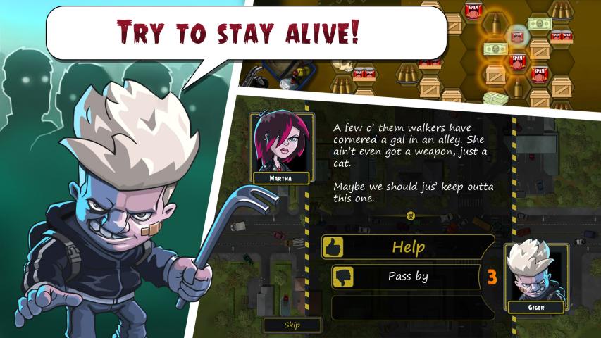 《僵尸小镇故事》(Zombie Town Story)是一款僵尸题材的消消乐游戏。搜刮、食物钱财等生存必需品,寻找废墟中的幸存者触发特殊事件,或是遭遇感染者围攻杀出一条血路,偶尔还跳出个黑商向你贩售私货。每个节点获得的收益全由内置的消除游戏决定,集齐六边形中的3个相同物资便可将其消除并收入囊中。合理选择路线,尽可能多的消除物资,直至出现下一个区域。