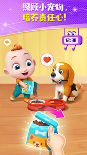 是谁在汪汪叫?是小狗!它的肚子快饿瘪了,需要进行喂食,宝宝来帮帮忙:撕开狗粮袋,倒满宠物餐盆。好像没吃饱?使用开罐器,再为它开一个宠物罐头吧。