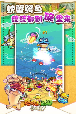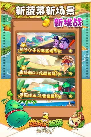 《燃烧的蔬菜3》是2014年倾情打造并发行的“燃烧的蔬菜”系列游戏第三代大作!游戏全新的侏罗纪世界,颠覆性的弹射与自动防御相结合的玩法,让玩家更加轻松游戏之余尽享弹射乐趣,三代游戏中除了闯关外更有菜园养成,碎片收集,挑战关卡等丰富玩法,让你游戏中乐趣多多,惊喜不断!