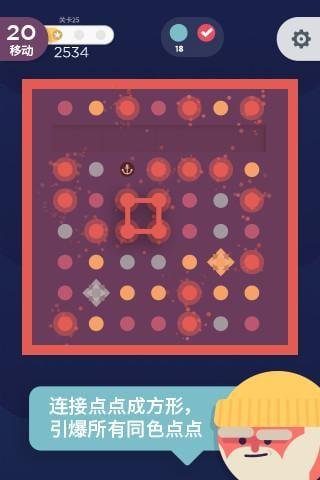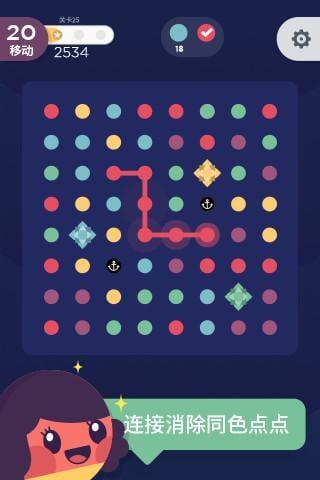 它的玩法非常简单,只要划动你的手指,将相同颜色的圆球连接起来即可消除。但只可横纵方向连接,不可连斜线哦。圆点消除后,点阵会整体下落,下落的同时又会有新的圆点加入进来。但消除圆点的次数是受限的,玩家必须要在规定次数内清除指定数量的彩色圆球,又或者通过消除圆点将物品从点阵的顶部运送出点阵底部。