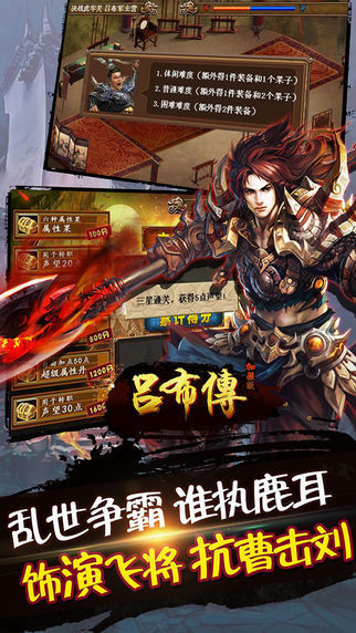 “吕布传加强版”让您告别失望,总有一种难度适合于你!游戏内设多种难度供您挑战。
