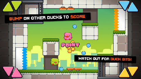 Use the buttons in the corner to control your duck. Tap multiple times to fly! Bump on other ducks to get points.