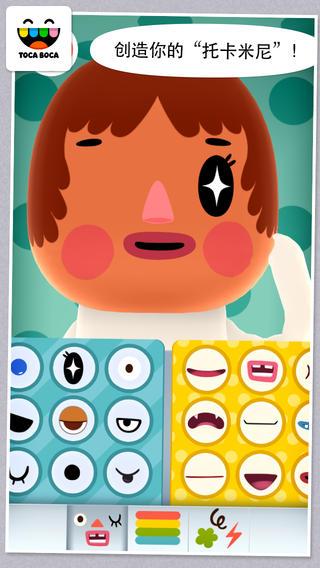 《托卡米尼》是一款为儿童量身订造、且创意无限的儿童教育游戏,缤纷世界中,一切由你做主。让我们开始吧,点击你的米尼来增添颜色、条纹、袖子还有裤子。发挥你的创造力来使用这些印章,他们可以帮助增添更多的细节,诸如帽子、袜子、花边和纽扣。增加面部特征可以让你的米尼微笑、打喷嚏和学会看世界!成千上万的混搭组合和无穷无尽的搭配方式,让你打造属于自己的独一无二的米尼!可别忘记给你创造的米尼拍张快照,分享给好朋友们喔。增加惊艳的动画效果,逼真的眼睛、嘴巴、鼻子和眉毛,60种颜色和78种双面印章可供选择,使用印章来创建图案、头发和服饰。许多五彩缤纷的背景可供选择!请发挥创造力,随性所欲的创造吧!