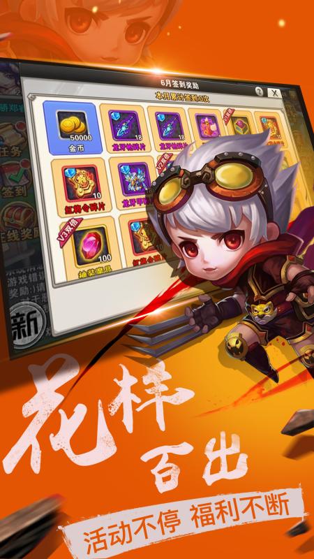 【最爽福利】全年送宝,high翻全场!登录就送橙将,在线就送钻石,更有各种签到,开服豪礼相赠,高品质游戏不需要坑钱。