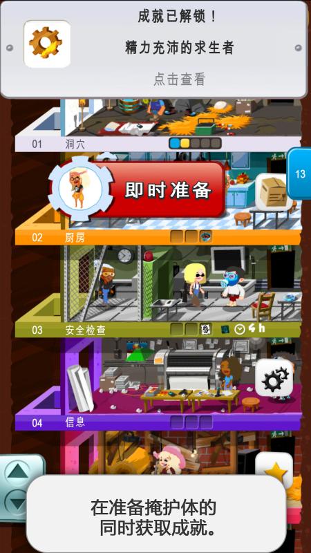 《末日生存者》是一款模拟经营类的休闲游戏,根据国家地理频道同名电视节目《末日经营者》制作。这款游戏中,你将接受挑战,在地下准备新的(也许也是更精彩的)生活。设计多层梦幻掩体,建造你在大灾难发生之后所需要的一切,从健身房到温室再到迪斯科吧,不一而足!一层层建立你的地下宫殿,同时在建造过程中衡量并提高你的生存技能,以此延长你在地下的寿命!努力建造吧!