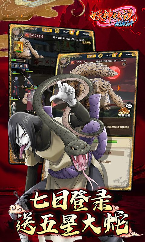 ★登录送五星大蛇丸、全套1星橙装、高级忍法帖*10、限定忍法帖*10、禁术忍法帖*5、金币*2000