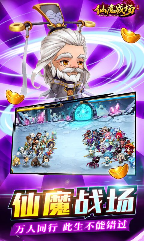 《仙魔战场》一款休闲放置仙侠手游,千万玩家给予角色同步登场,给玩家创造了一个轻松自在又无比熟悉的修仙大世界。将经典玄幻修仙与Q萌逗趣的画风以及休闲的寻宝放置玩法相结合,开启一段属于你的修仙之路,特色寻宝玩法、专属法器打造、全民竞技PK,现在从这里开始!