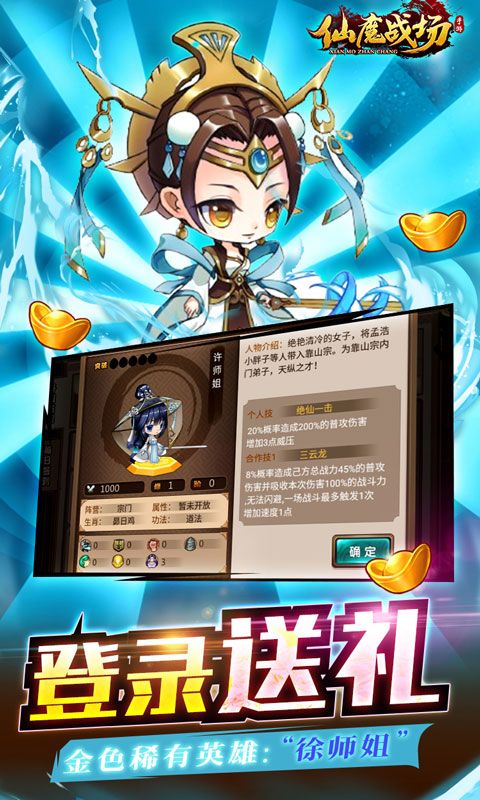 ★【开服送礼】:连续登陆可免费领取“金色稀有英雄:徐师姐”还有免费货币
