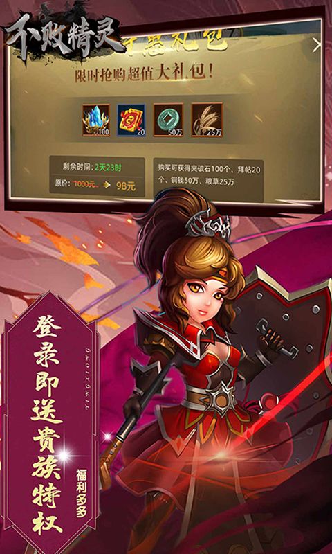 《不败精灵》是一款以三国为背景的战争策略类手游,游戏特有的战阵策略模式,摒弃了纯数据比拼,让战斗变得更加刺激有趣。玩家可以在游戏中收集诸多三国名将进行培养,并率领麾下大军参与国战,攻城掠地,在乱世中建立属于自己的势力。名将养成、实时国战、经典战役、争夺城池 ,精彩尽享!
