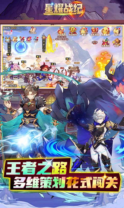 《星耀战纪(首续0.1折)》是一款以架空三国世界为背景的超必杀策略激斗卡牌手游。游戏借用了三国中大家熟悉的人物和人物关系,构建了一个架空的演义世界,由于妖魔的入侵,这个世界无时无刻都面临着终焉末日的威胁。 星使是拥有统御星灵能力的天命之人,将率领星灵们从不周山出发,一路过关斩将收复城池,击败魔王拯救演义世界。