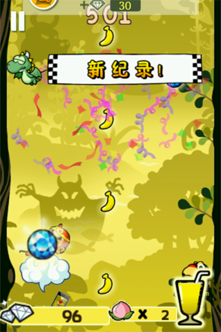 弹跳的过程中也会遇到很多的道具和障碍。非常值得一提的是前作的神灯和气球分别被替换成了天书和云朵。悟空腾云向上的时候吃香蕉的表情实在是让人欲罢不能啊。收集足够的香蕉之后悟空可以喝掉果汁来换取向上弹跳的力量,这也是远离金刚的一个绝妙技能。