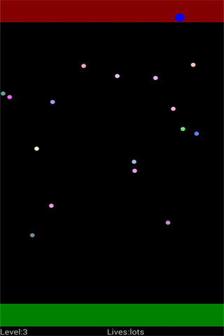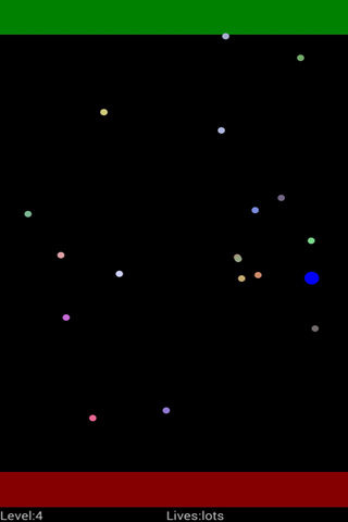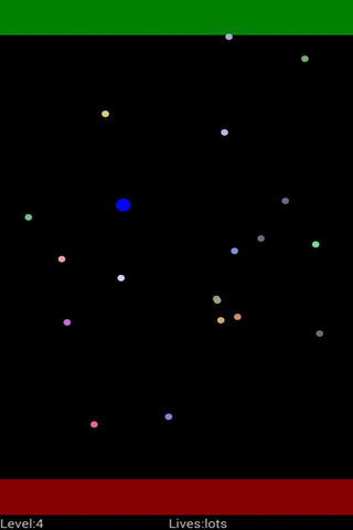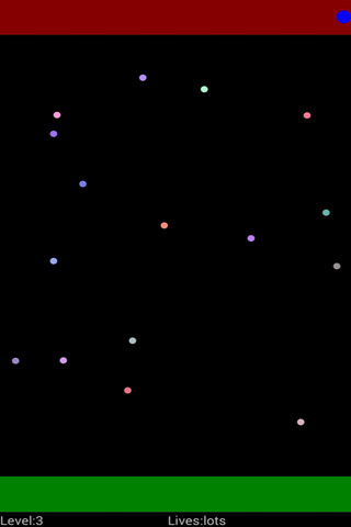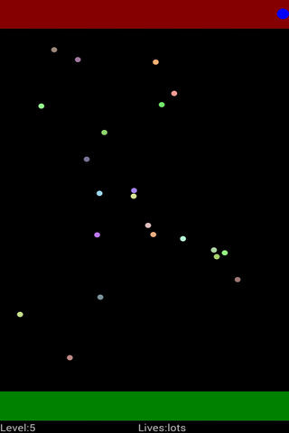 蓝点是你自己哦!你可以指导你的球穿过星阵,点击屏幕即可开始;到达对面的红线与绿线为每关的升级点,在次过程中可以使用加速剂来快速完成。