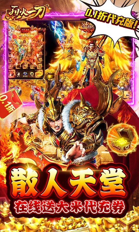 《烈火一刀》0.1折代充版,全部充值永久0.1折!上线送狂飙大礼包、技能十步一杀、【称号】大米代充、狂飙魂环(体验)、神赵云体验时装!散人天堂,在线送大米代充券,绝版时装和超强武器!全新大米代充系统,零氪也可获百万大米!送无限点充,免费兑换首充、自动分解和自动回收!