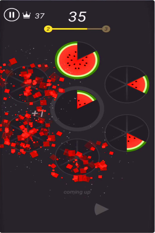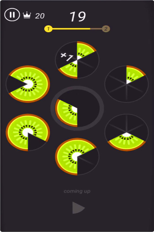 游戏模式一拼水果:轻点外侧的某一个美味圆圈,将美味碎片放入,逐步填满每一个圆,看它炸裂成一片美味烟花!