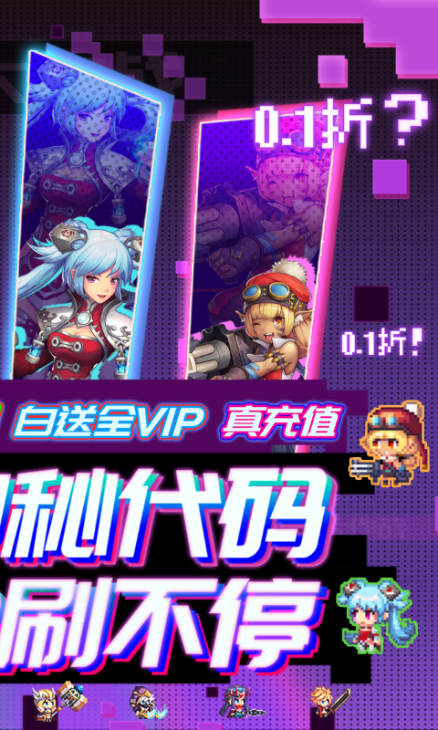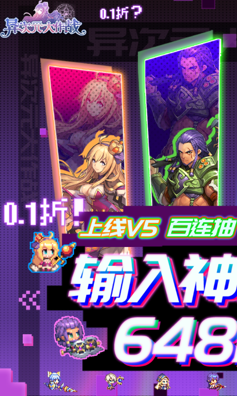 《异次元大作战(转生后竟是0.1折)》是一款像素风塔罗挂机游戏!重磅消息!!0.1折版本上线咯,648元充值只要6.48元! 上线送V5,白连抽;引导走完就可输入代码获得648元充值卡;挂机闯关还能获得大量充值卡福利,最高可以合成648元充值拉;免费VIP用648元充值卡免费激活,还能提升代码输入次数,多档奖励,输入代码免费刷;