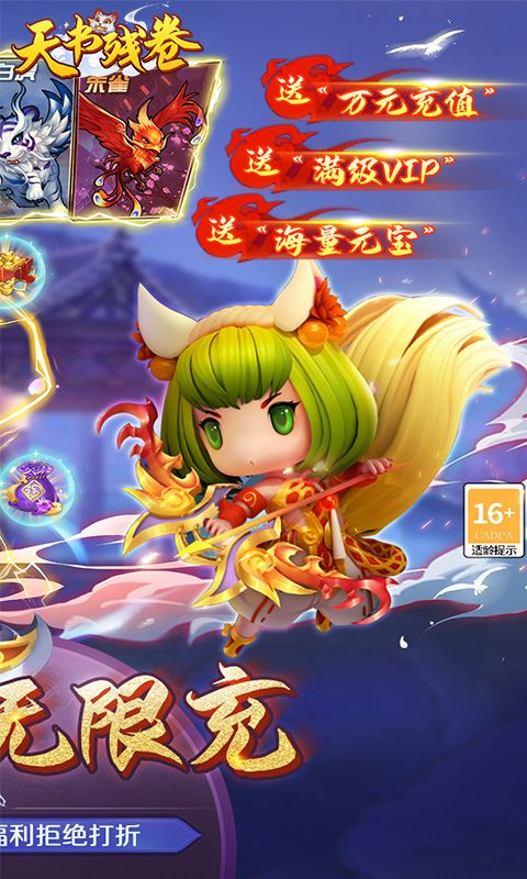 《天书残卷》是一款首创合成+即时的Q萌风格的修仙游戏,所有充值均为0.1折。神宠全靠合,一直合成一直爽。题材取自山海经神话故事,细腻的画面清新亮丽,让你拥有特效绚丽的技能和造型多样的装备,与仙魔神妖展开激烈对战,穿梭在极美超仙的神话世界中!