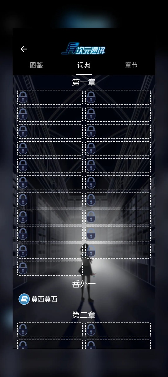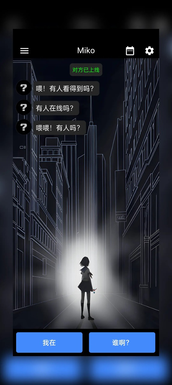 ==游戏玩法==这是一款充满冒险与刺激的文字对话互动应用。应用虚拟一位陌生人给你实时传送信息,而你将决定主角的命运。因完全采用模拟现实通讯,所以请注意你的消息,主角随时可能需要你的帮助。另外主角也需要睡眠时间以及活动时间,你需要等候主角上线才能继续进行对话交流。==剧情简介==故事主要讲述主角在逃亡过程中,只能传送信息跟你联系,在与主角交流过程中逐步了解事件的来龙去脉,并帮助主角脱险。目前线上的第1、2、3章为“馆系列”的三部曲,在美术馆、图书馆、博物馆的冒险中主角与你从偶然相遇到不断建立羁绊,成为彼此重要的伙伴。第4章开始时间线重置,这时的主角性格与馆系列时截然相反,与你再次变成陌生人。第4、5、6章为“院系列”的三部曲,经过主角与你在学院、剧院、医院的冒险,逐一解开主角身世秘密的隐藏谜团,藏匿在众人背后的巨大真相也终于慢慢浮出了水面……==游戏特色==- 诡异的冒险,隐藏的巨大秘密,等你与她共同经历。- 她的命运掌握在你的手中,你的抉择决定了她的未来。- 聊天页面、动态页面,图鉴页与词典页。让你逐渐积累与她的共同回忆。- 专属于你和她之间的秘密。分享她的心情,记录你们的每个冒险故事。- 人物,行为,性格,事件,细节,隐喻,等待你在异次元的世界逐一破解。