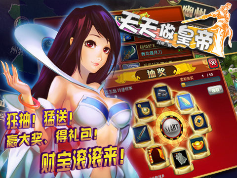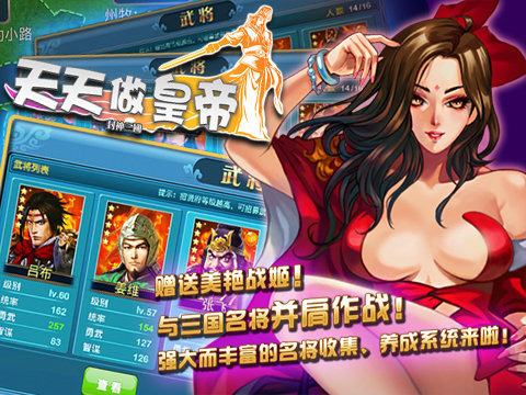 创新型大型角色战争策略手游《天天做皇帝》,让你真正感受到运筹于帷幄之中,决胜于千里之外的感觉。游戏将角色扮演、策略及卡牌融合于一体,堪比端游的游戏画质,让用户真正感受到游戏的魅力,打造全新的游戏体验。