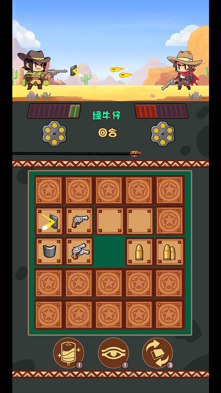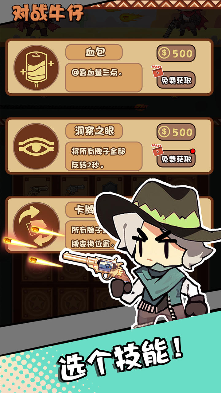 欢迎来到西部!在这个游戏中,卡牌将是这场牛仔之间决斗的秘密武器。作为一款有趣的记忆卡牌游戏,他采用了西部决斗的主题和回合制的策略,在这场决斗中,你既需要超强的记忆力,还需要灵活的战术策略,才能赢得这场战斗!!