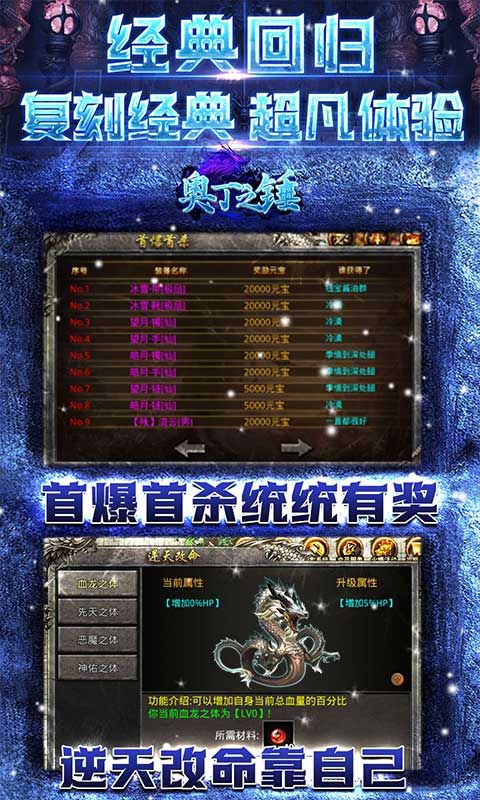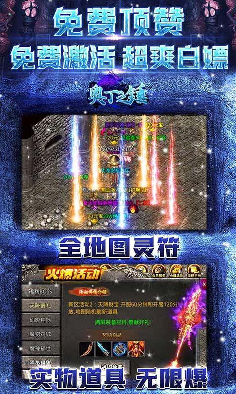 《奥丁之锤(冰雪折扣永久购)》0.1折冰雪版本强势来袭!游戏内置全部充值均为0.1折,超爽体验,微氪霸服!最经典的传奇味儿,完美复刻冰雪传奇,绝非市面上割韭菜的传奇,原汁原味复刻传奇核心玩法,多人BOSS夺宝,血战沙城PK,还原经典传奇场景,无兄弟,不传奇!击杀怪物可领取海量道具,本服无任何绑定限制,自由交易,上线免费送自动挂机、 自动拾取、快速分解,一切全靠爆游戏中获得的灵符,装备,材料,打怪均能掉落!更有实物兑换最高可触发10倍灵符,打怪白嫖,散人也可霸服!