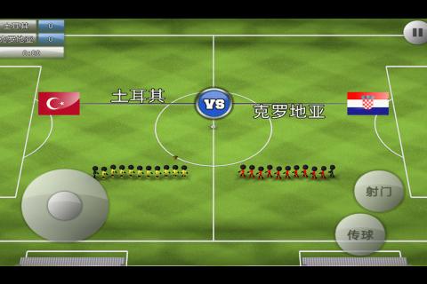 《火柴人足球》保持了了火柴人一贯简约的风格,球场上的22人,除了衣服颜色不同而外,其余外形还是动作,都是一样的,球场也没有过多的修饰,画面给玩家整体呈现一个简单明了的画面。玩家们别看《火柴人足球》小巧简约,其实这款足球游戏是“麻雀虽小五脏俱全”啊!游戏操作也十分的专业,左边的虚拟摇杆控制移动,右边只有传球和射门两个按键,但这并不代表它玩起来很容易,传射和摇杆方向的配合尤为重要。