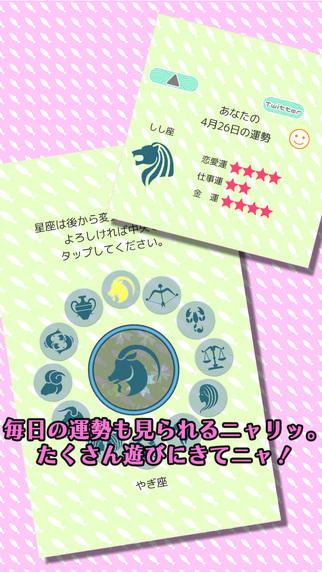 《猫咪占卜》(ねこどろっぷ)是一款神棍类休闲游戏,游戏中,你可以选择你自己的星座,一只懒猫会帮你占卜,了解你的运势和感情状况。要是想得到好运势就多给猫咪喂点吃的吧!喜欢此类游戏的玩家快来下载这款《猫咪占卜》体验试玩吧!