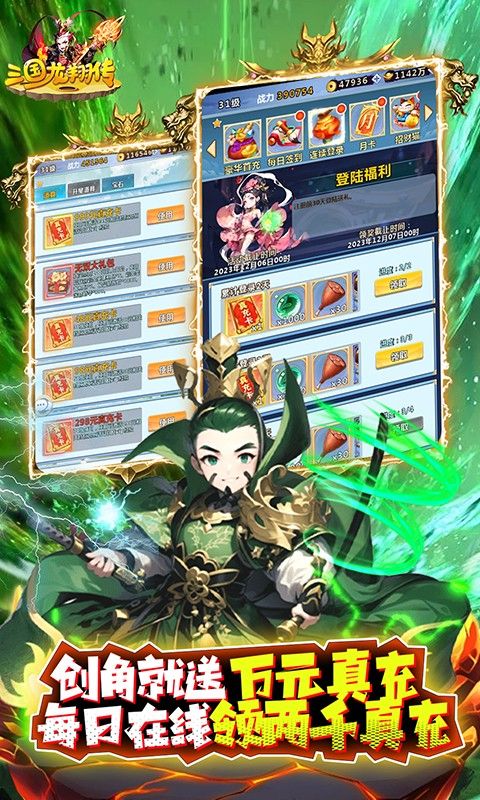 ★创角即送免费无双特权、200无双币、真满V、一万元真充卡、金币888万、元宝88万、体力5000