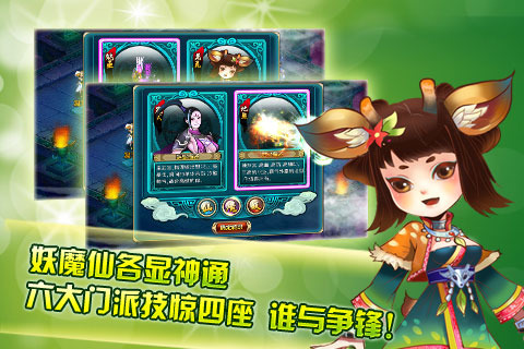 重磅仙剑风回合制策略手机网游,国内首创APC功能丰富社交!无商城模式打造中国第一免费手机网游!魔族能挡千军犯,仙族仗剑傲人间,妖族魅舞自称天的三大职业,六大门派风格各异,独树一帜,任君选择。丰富装备终身享用,绚丽技能震撼夺目,宠物过百随心搭配,仙禽灵兽任您坐骑。更有各种小游戏轻松怡情。快来体验吧。
