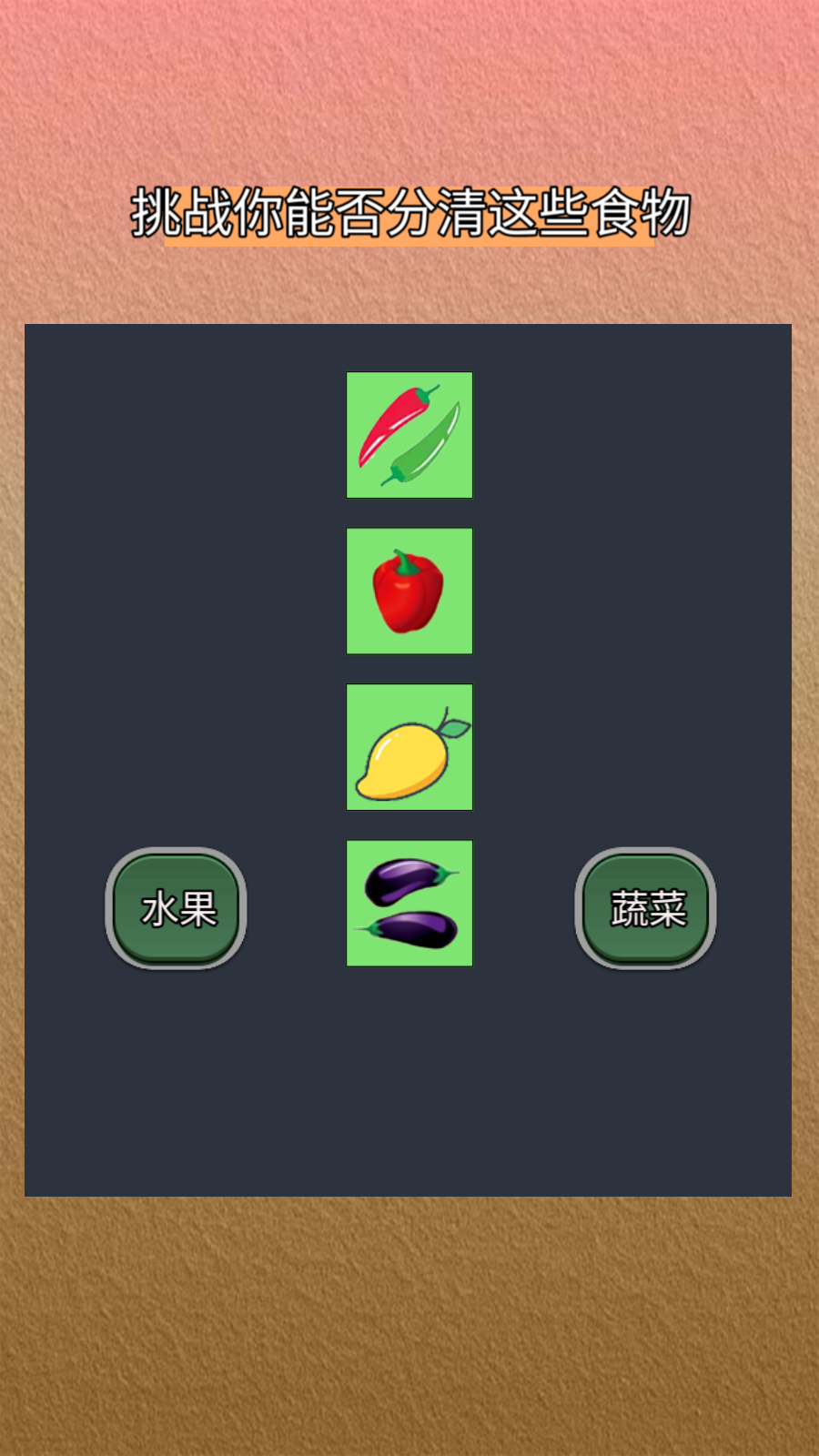 玩家根据图片上面的内容来,来分清楚图片中的是属于蔬菜还是水果,快来一起玩玩吧!