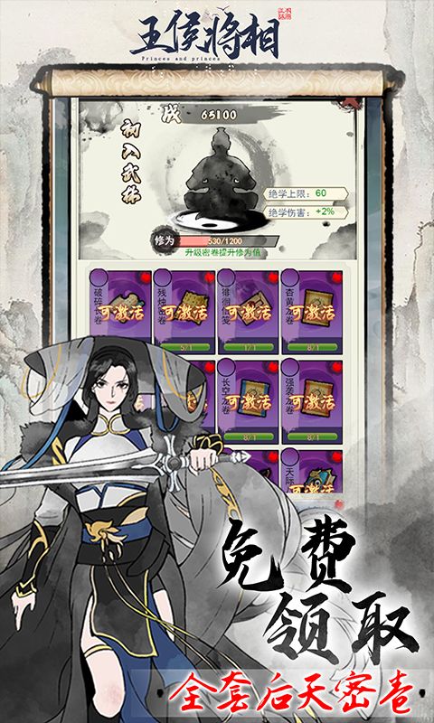 爆爽竖版水墨风放置割草手游-《王侯将相(0.1折全密卷无限648)》震撼来袭!游戏全场永久0.1折,无限永久领648真充卡,可激活全SVIP和全等级霸服商城!创角自提无级别红装套,免费领取全套后天密卷,更有百倍返利免费激活!泼天福利,放置玩法,不肝不氪,同样能给你带来超爽的游戏体验!快来一起激情打宝,快意江湖吧!