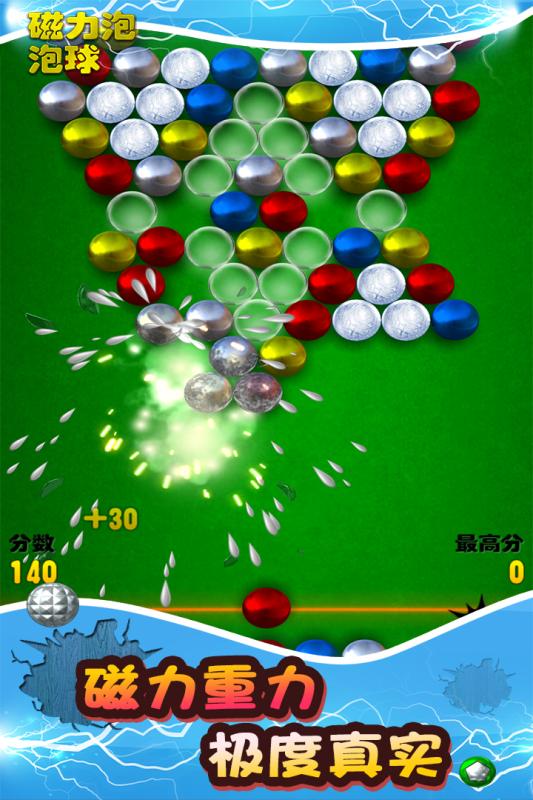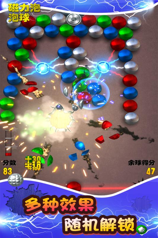 一款极易上瘾的磁性球消除免费休闲益智游戏,通过控制发射磁球,将三个相同颜色的彩色球连接并消除,可帮助您清除当前关卡并将进入后续关卡。该游戏不同于普通的三消游戏,在其基础上,增加了仿真模拟的磁性、惯性等物理元素,以及炸弹、闪电、冰冻等多种真实元素,让你在游戏过程中,感受物理知识的魅力。