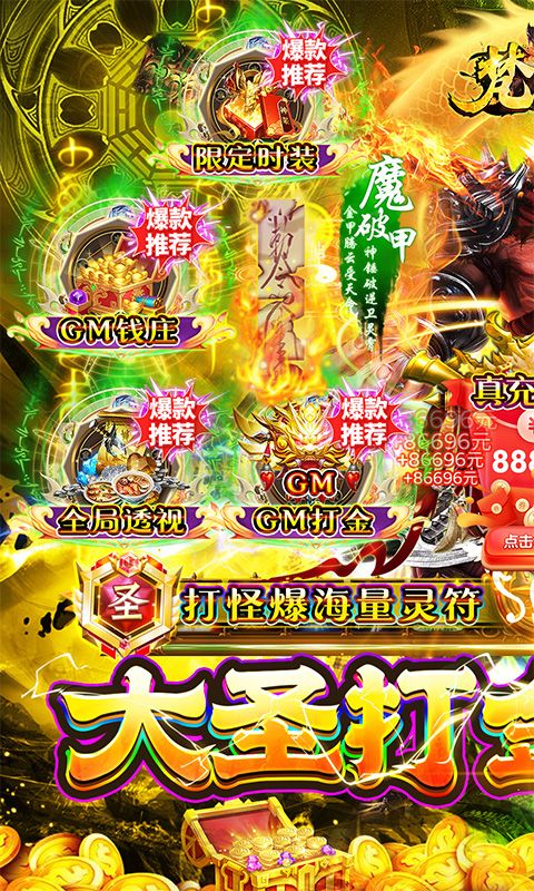 《梵天巨翼(0.1折西游打金服)》全新西游永久0.1折传奇,年度爽服,齐天大圣,称霸沙城,开局领全局透视+满级VIP+刺杀剑术+200W元宝,全新大圣专属系统战甲系统,助力狂虐BOSS,更有神位商店1灵符购买道具;所有地图爆大量充值,小怪掉充散人天堂,无限打金!全角色攻速大提升,开局开砍,暴爽打金!全新优化所有boss爆率,全程掉落高级神器,全面提升打金爽感,这一棒叫你灰飞烟灭!