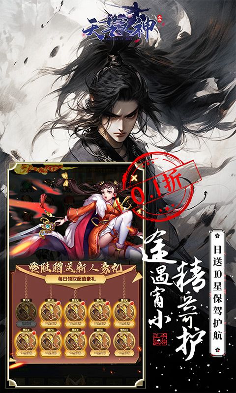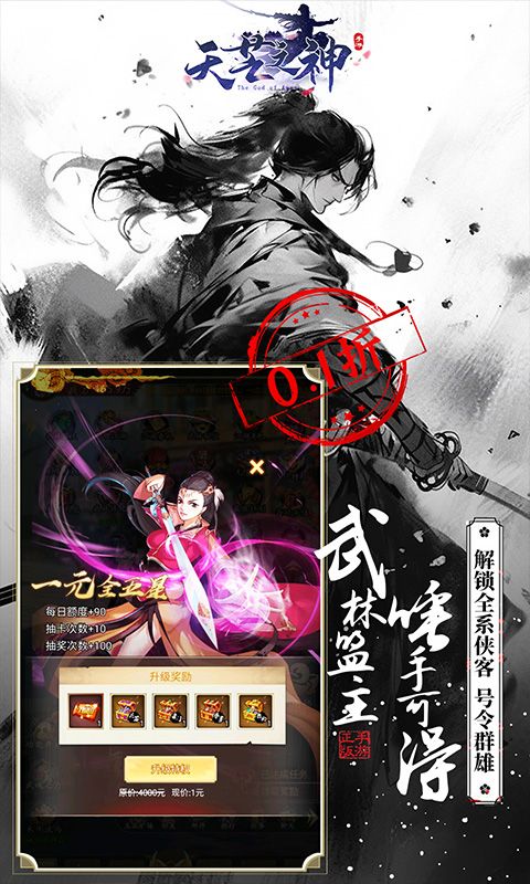 ★后缀说明:充值永久0.1折,天天送10星武侠,【武林盟主】1元解锁全侠客(折后1分钱)