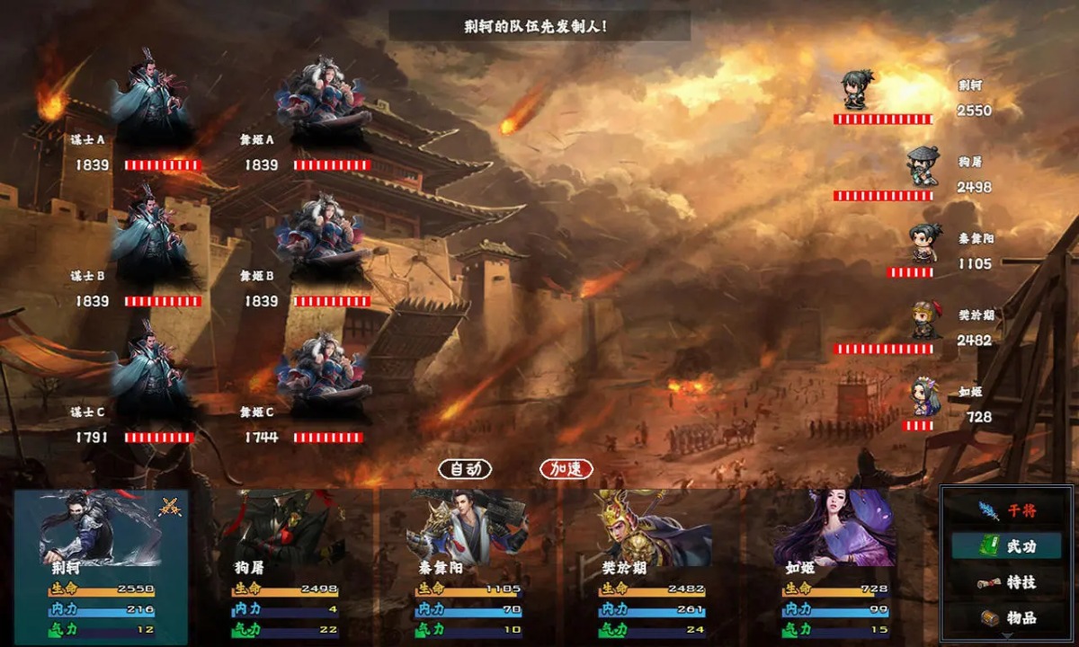 这是FC荆轲传奇的复刻加强版,描述荆轲刺秦王的这一历史事件的RPG游戏,游戏情节加入大量新剧情,大大提升了耐玩度,人物上也相应增加了!"风萧萧兮易水寒,壮士一去兮不复还"。战国时期,秦国日益强盛,意欲并吞六国,统一天下。 燕国太子丹被扣在秦当人质,受尽欺凌,历经千辛万苦,终于逃回燕国。 在群臣的协助下,制定了谋杀秦王赢政的计策 并找到荆轲担任这项艰巨危险的工作。 荆轲知道秦宫戒备森严,此去必死无疑,但他仍然义无反顾地接受了任务。 尽管刺杀没成功,但荆轲舍身取义,视死如归的精神,千百年来,激励了无数的爱国志士,成为中华民族魂的象征。