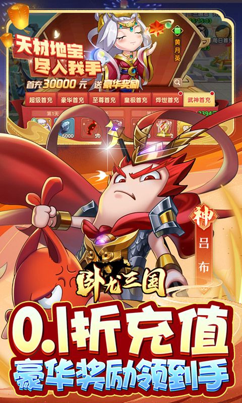 《卧龙三国(真三国送万抽0.1折)》是一款独树一帜的恶搞风放置卡牌游戏,经典的名将混搭诙谐萌趣的故事,带你了解不一样的三国。热爱创业的曹操迎来事业最大危机,肥宅董卓因为美食冷落了美人貂蝉,赵云竟因为没找到女朋友荣获了最强剩斗士这一称号。当这些奇葩名将集结在你的帐下时,会碰撞出怎样的爆笑体验,快来瞧瞧这个脑洞与画风一同放飞自我的三国,让你笑到停不下来,游戏内充值仅需0.1折