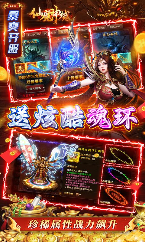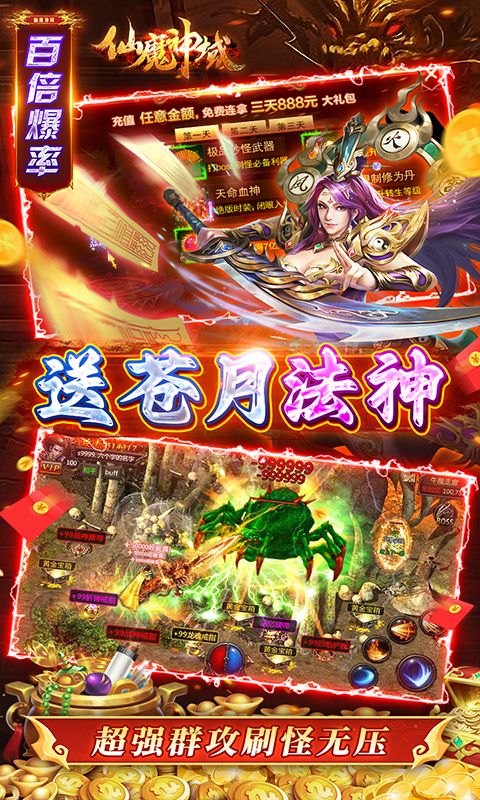 《仙魔神域(0.1折高爆三职业)》全部充值永久0.1折!上线送战狂魂环、38888绑元、10亿绑金。累计登录送苍月法神,超强群攻刷怪无压。在线领经验珠、修为丹,升级转生无忧!激情百倍爆率,万物皆可爆,刀刀暴击,光柱满屏!