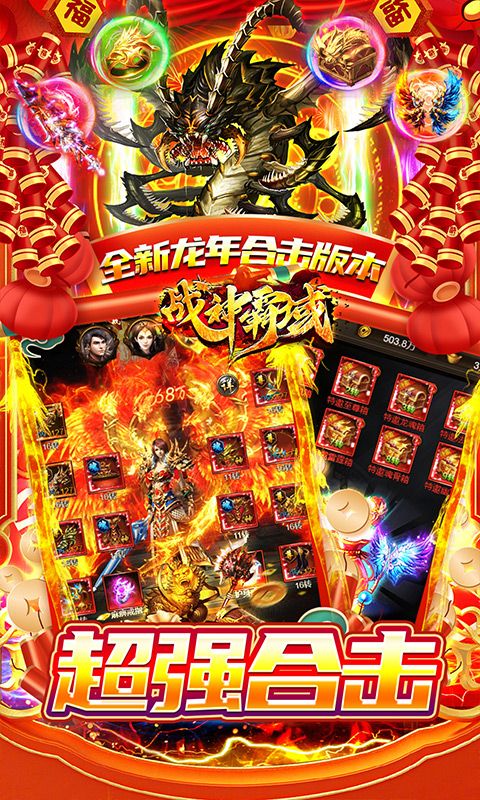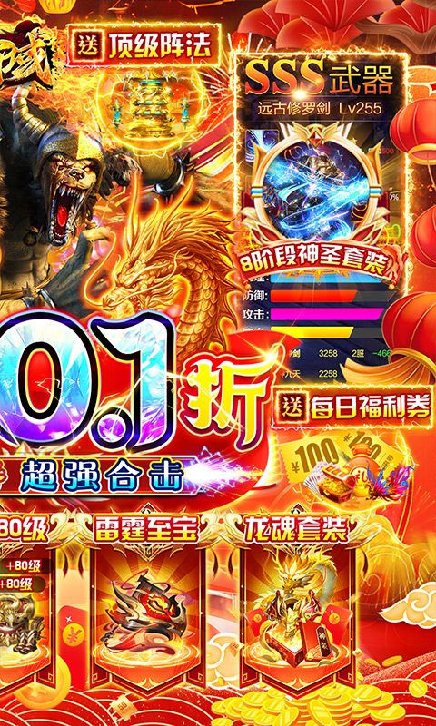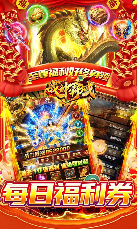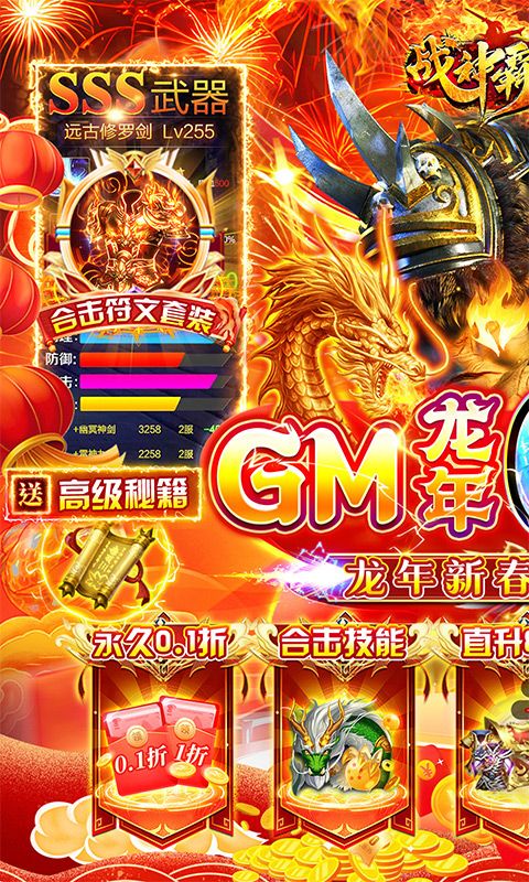 《战神霸域》全新龙年合击版本,充值永久0.1折,上线直升80级+合击符文套装+雷霆至宝+8阶神圣套;还有至尊福利号,终身可领福利券,每日至少648起;免费打宝获得顶级法阵,登录次日领战灵幻形浴血火龙,还有雷霆至宝,高级秘籍可领,全场充值0.1折,数值不膨胀,福利超级多!