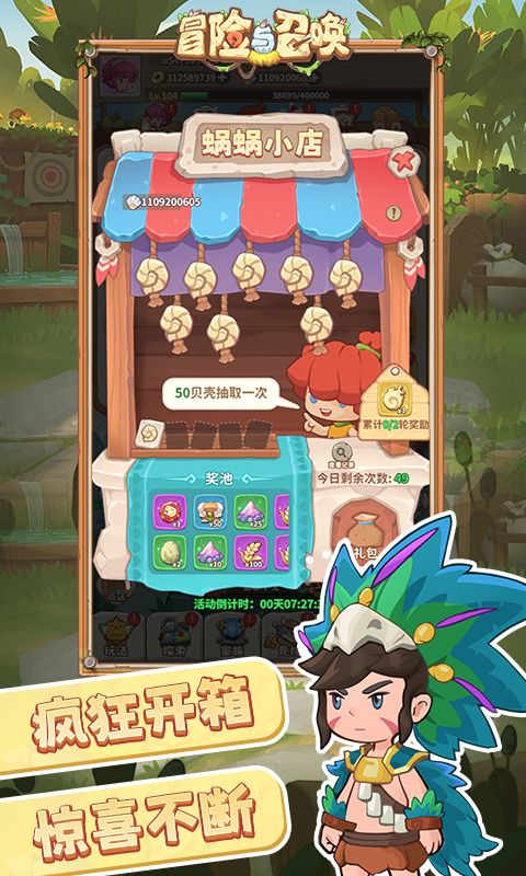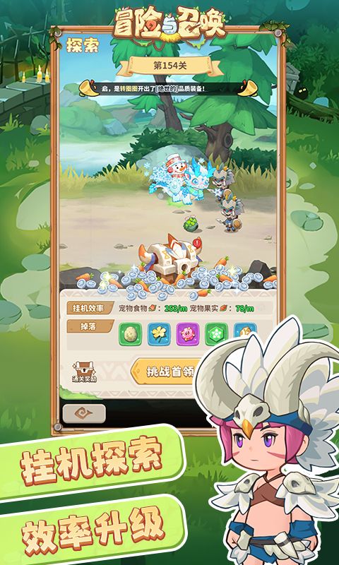 《冒险与召唤》是一款休闲放置的开箱小游戏,玩家将作为生活在石器时代的小原人,与众多远古异兽为伴。但不需要通过对抗远古怪物获得装备,也不需要闯过一个个难关提升等级,只要不停的打开眼前的宝箱,各种远古神级装备唾手可得,游戏中还有各种上古坐骑,可爱萌宠与你一起探险石器时代,使你可以充分感受石器时代的魅力。