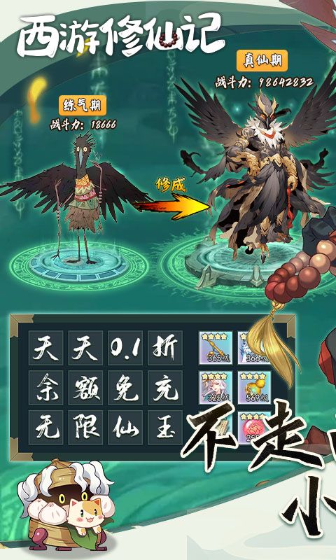 《西游修仙记(小妖砍树免充服)》首创西游开箱玩法,召集大千世界各路小妖,寻道修仙,砍树无忧。登录就送无门槛648,每天0.1折!内置免费氪金修仙外挂,现金点抵扣计费点,轻松获得百亿修为,上线即结丹,一天元婴,七日成神。