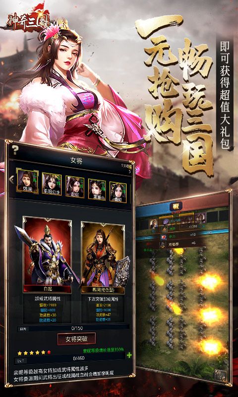 《神奇三国(0.1折三国无双)》是一款以三国历史为背景的策略手游,玩家可以在游戏中升级自己的城池,收集三国名将,通过挑战经典三国战役和野外流寇来提升部队战力。玩家将分属不同的国家,对城池展开争夺,获胜者可以扩展本国版图,最终攻占皇城洛阳,统一天下
