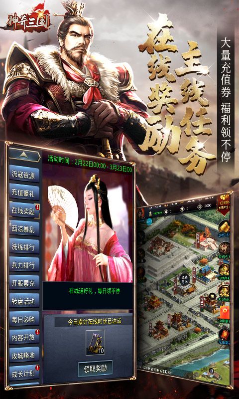 ★福利2:充值比例1:500,七日登录送充值券、金色装备、红色装备、女将碎片、超强武将典韦,大量材料等您来领取!