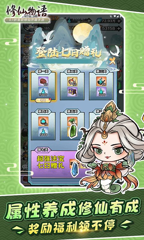《修仙物语》0.1折修仙开箱,好运开出来!开局一个小木鱼,敲呀敲呀破碎虚空!上线送木鱼*500,灵气*50000,加速券*100,助你修仙有成!特色自动敲鱼功能,助你快速挂机轻松修仙!修仙敲小木鱼就能变强,不肝不氪飞升仙界!