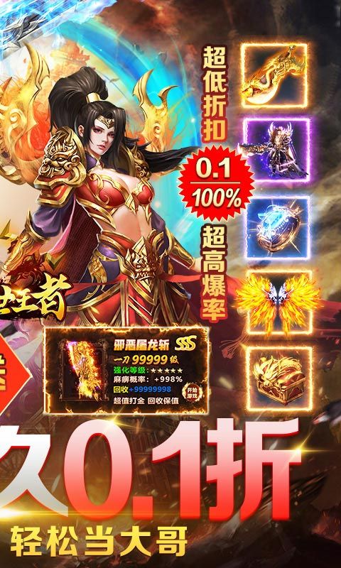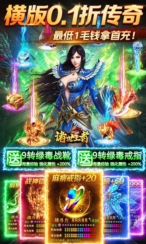 《诸世王者(0.1折扣版)》经典传奇玩法,带你梦回沙巴克;全新合击系统,尽情享受PK乐趣。传奇不等待,要爽就现在。强大的Boss、绚丽的羽翼、远古的神兽、多样的兵魂、特殊技能的神兵、神秘的剑灵等着你去探索与征服。游戏内容非常丰富,累了也可以放下手机挂机得装备和经验!