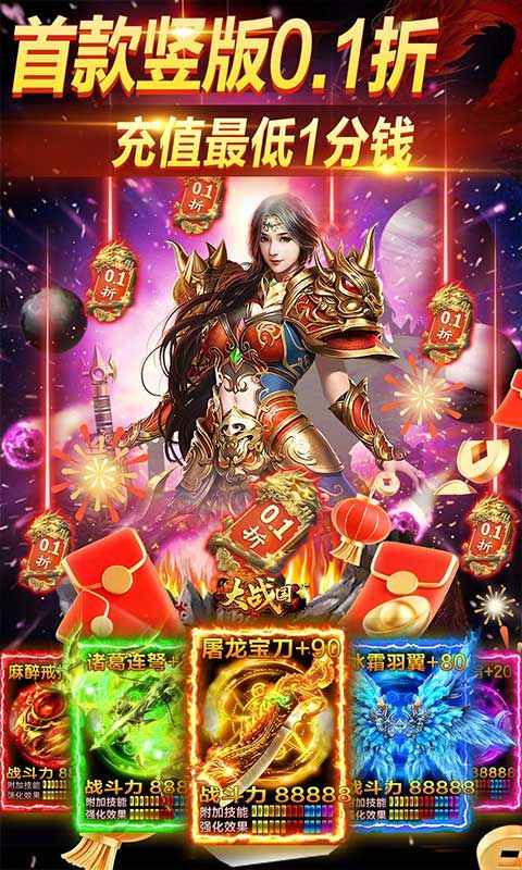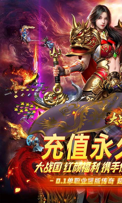 《大战国(0.1折福利免充值)》是经典竖版单职业真0.1传奇,强势王者归来!精美的游戏画面,丰富多彩的游戏系统,给玩家畅爽的传奇游戏体验!-红颜知己伴传奇战神--随我仗剑天涯战群雄-一款独特创新的单职业传奇游戏,高清炫丽的游戏画面给玩家带来无与伦比的游戏体验,夸张酷炫的技能表现给玩家带来耳目一新的感觉,游戏内有海量boss随便刷,光柱道具满地爆,还有真实沙巴克攻城战、剧情式打宝地图,创新的攻城掠地玩法等多种玩法系统等待玩家体验。每天上线送海量道具,海量元宝来玩就有,更有各种神秘高性价比道具等待玩家发现扫货,不肝不氪,轻松挂机即可战力飙升。