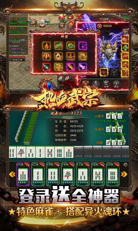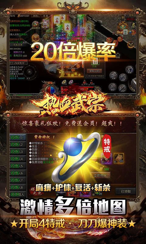 《热血武宗》是一款经典传奇全新高攻速高爆率版本手游,游戏上线送SVIP2直升卡、8888绑定灵符,300w元宝,神兽白虎*1,稻草人时装*1,登录免费送全神器,上线即拥有400%满攻速及200%移动速度!超高爆率刀刀爆光柱,神装神器全能爆,海量道具灵符回收,专属打金系统,仅需打怪即可获得打金点进行免费充值,0.1折版本所有充值实付仅需1%!