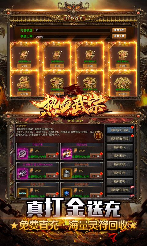 ★专属打金系统,仅需打怪即可获得打金点进行免费充值