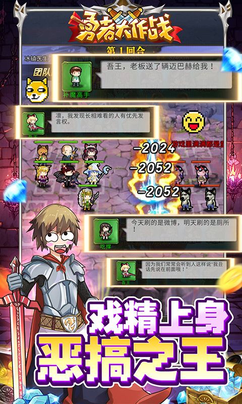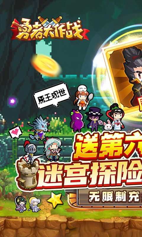 无限勇者魔性手游《勇者大作战》回归了!!!颠覆你的世界观只需0.1秒。多元玩法组团开战,躺着也能嗖嗖升战力!更有让人欲罢不能的弹幕吐槽,23333!在《勇者大作战》中,不仅有有趣的关卡游戏,还有神秘的秘境冒险和激动人心的BOSS对决。不仅如此,游戏中的英雄将可爱和搞笑完美地结合在一起,他们每个人都有一个大脑袋,包括三国时期的刘关张、城市白领和程序员。我们童年记忆中的各类网络用语和角色,都在游戏中唤醒。