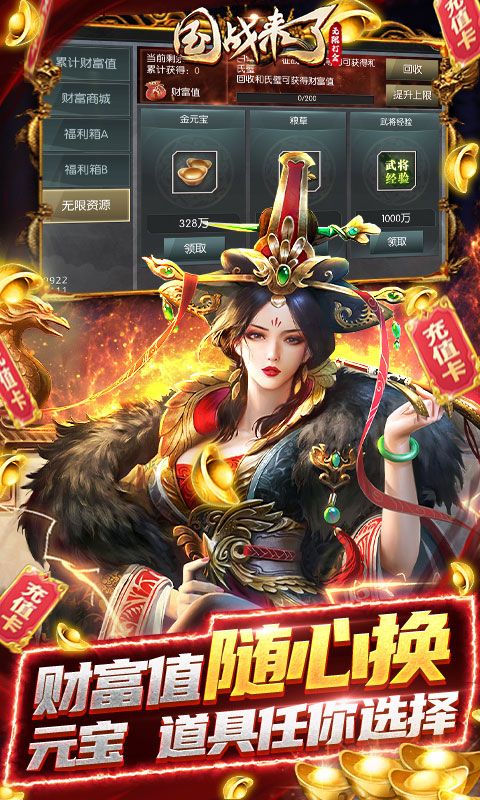 全新1折版本福利《国战来了》火热上线!顶级团队耗时3年打造传统三国策略大作,给玩家还原最真实的三国武将,体验最真实的三国。上线就解锁满级GM、解锁无限回收、解锁GM工具、解锁神将神装。在游戏中,你将置身于三国战场,发展势力,招募良将,和盟友一起争夺洛阳!不需要担心土豪大佬碾压全服,游戏内剿灭土匪刷充无限爆,充值卡还可激活所有累充类型的-活动。杜绝“鬼服”“村服”,游戏中的赛季制“天下布武”玩法让玩家不再孤单。策划承诺,将虚心听取玩家意见,游戏版本内容持续更新!力求为玩家打造一款福利真实,有趣耐玩的正统三国策略手游!
